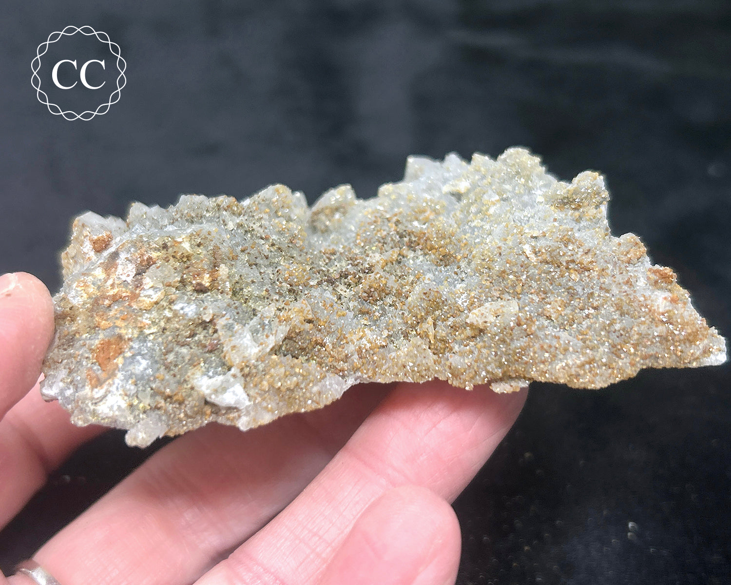 This is a rare find of tiny Rhodochrosite rhomb crystals on double layer growth Quartz from Djurcovo, Laki, Bulgaria (sometimes spelt Djurkovo). This is a very rare find of Rhodochrosite, as most of the famous pink Bulgarian Rhodochrosite comes instead from the Madan Ore fields in Bulgaria. Instead of your typically pink crystals, these are an orangey colour, which is due to iron substituting for some of the Manganese which typically gives it it's pink colour. You will receive the exact Rhodochrosite specimen pictured.