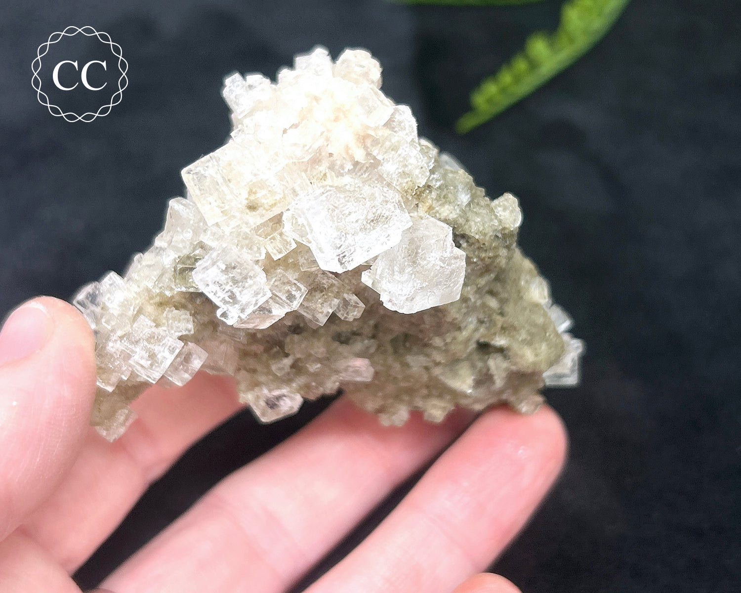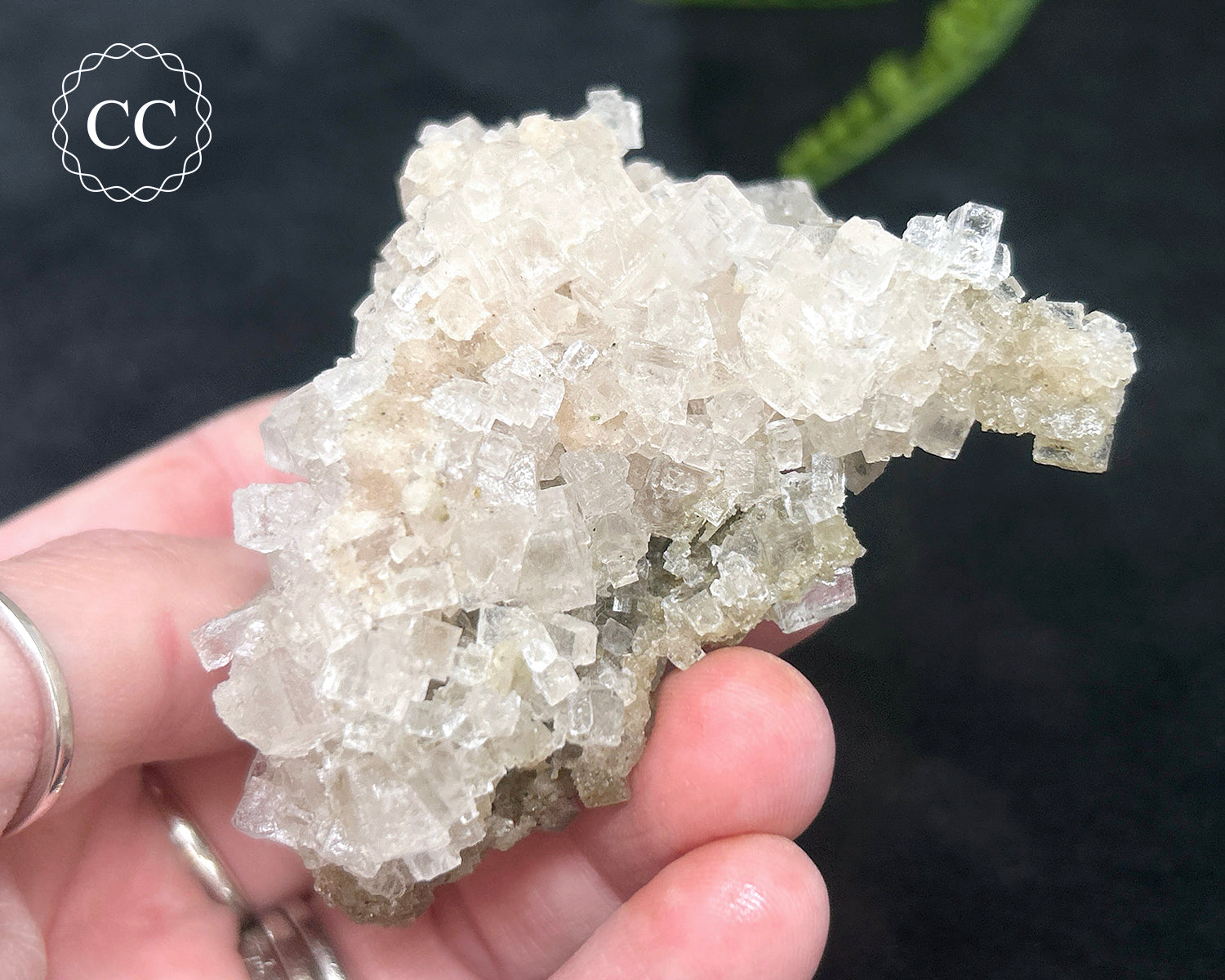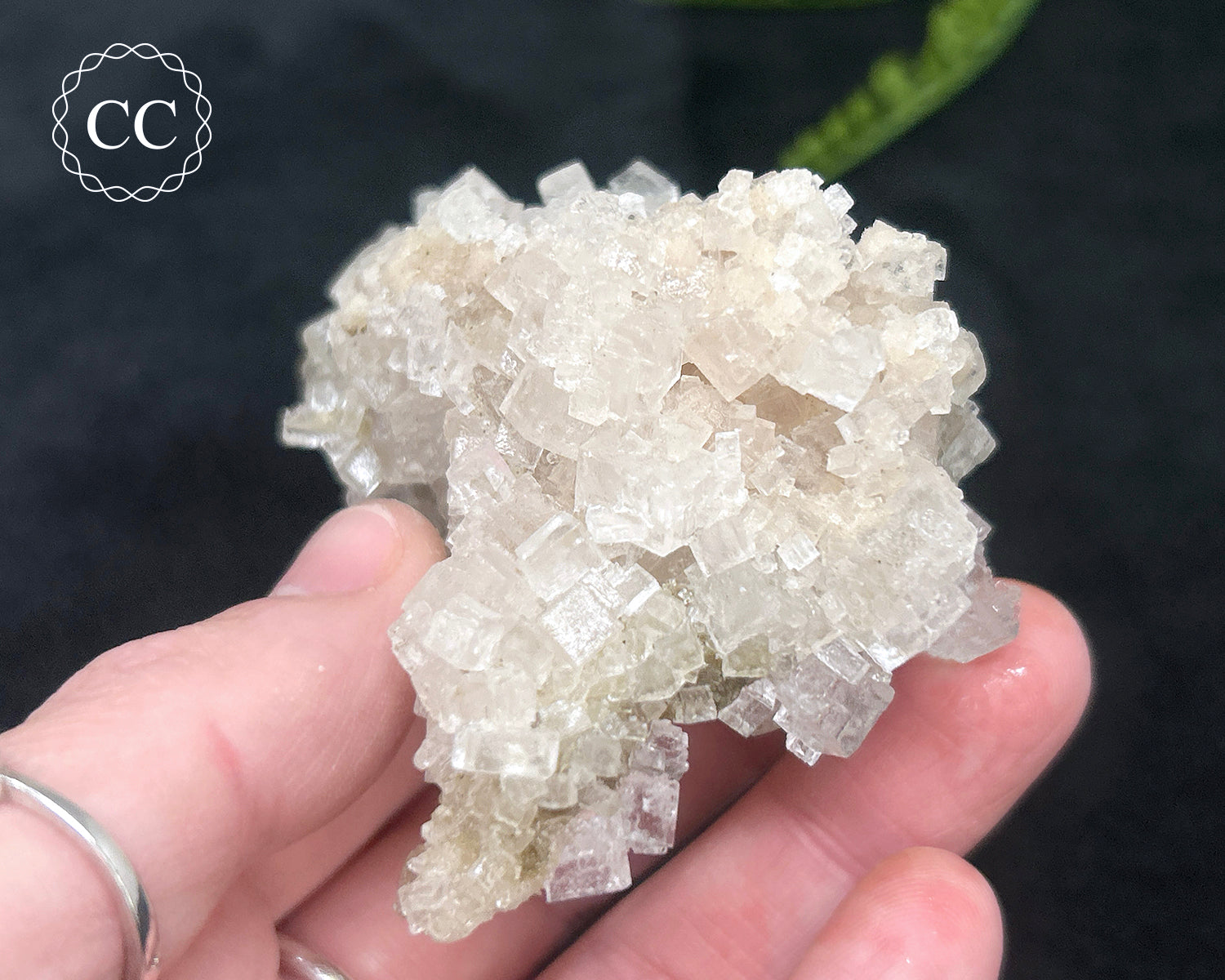This sweet Halite cluster specimen is from California. This cluster is sensitive to damp and humid environments so keep dry. You will receive the exact Halite crystal pictured.