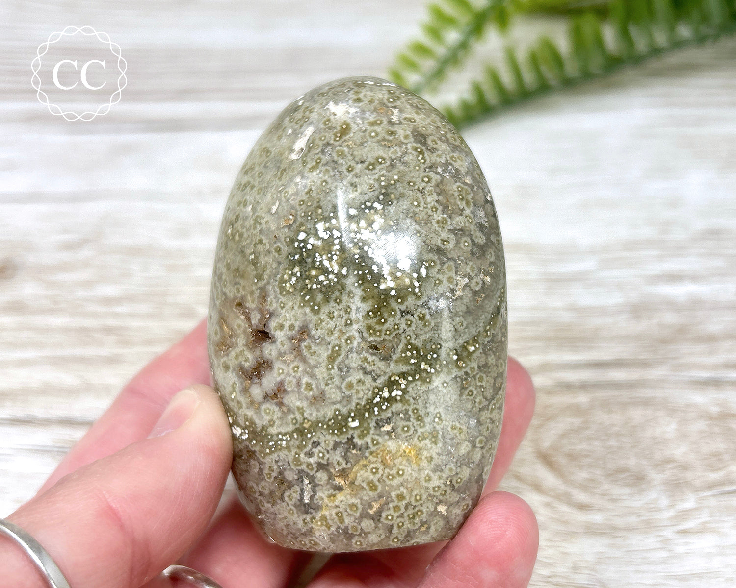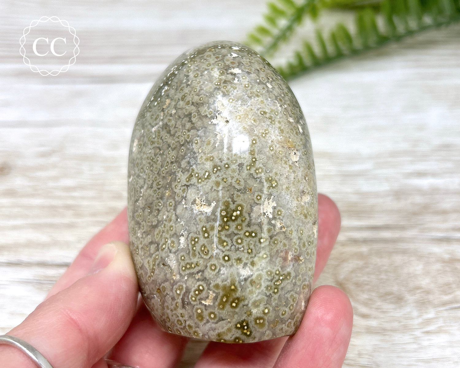 This beautiful Ocean Jasper cut base freeform is from Madagascar and is covered with flowery green orb patterns. You will receive the exact Ocean Jasper crystal shown in the photos.