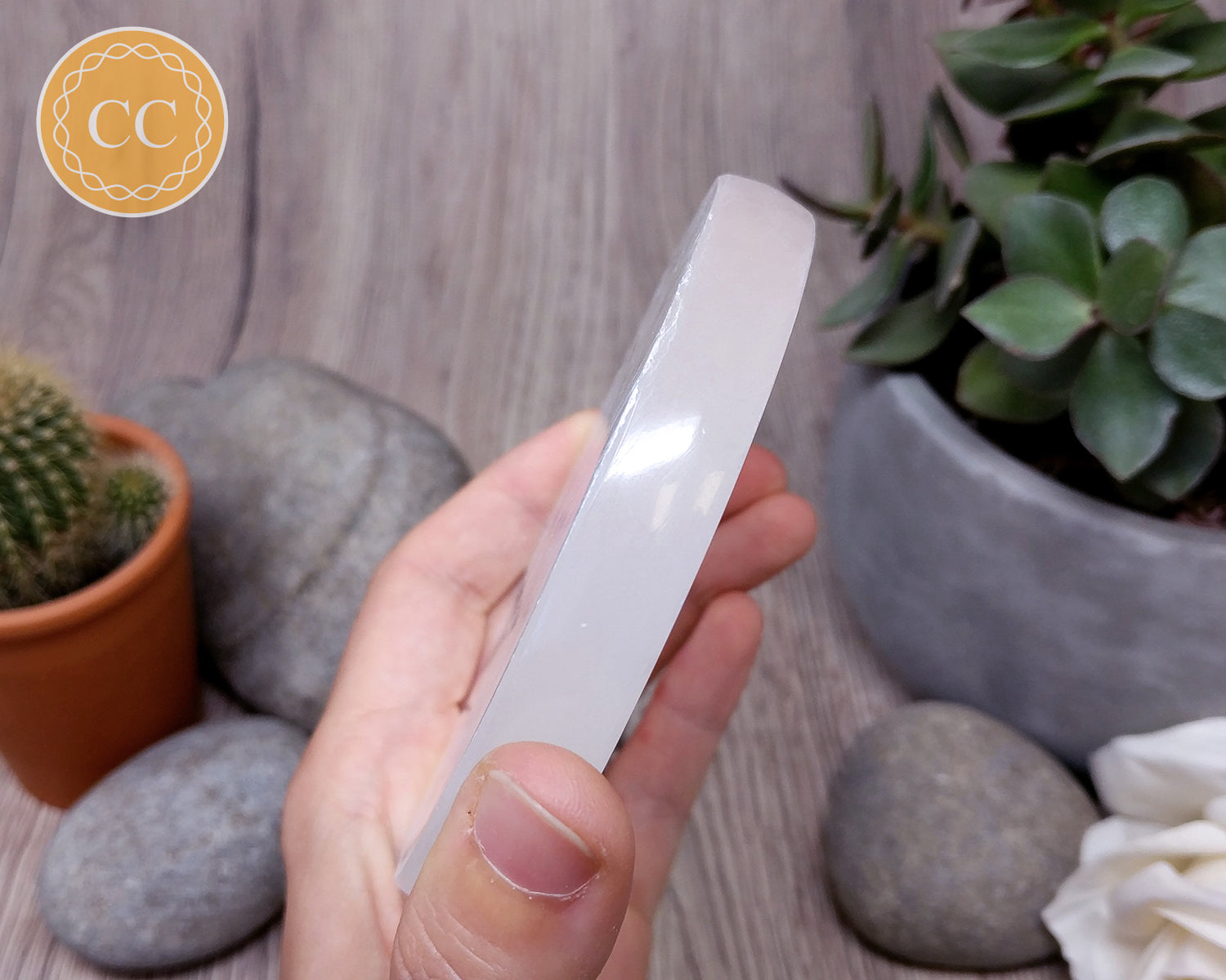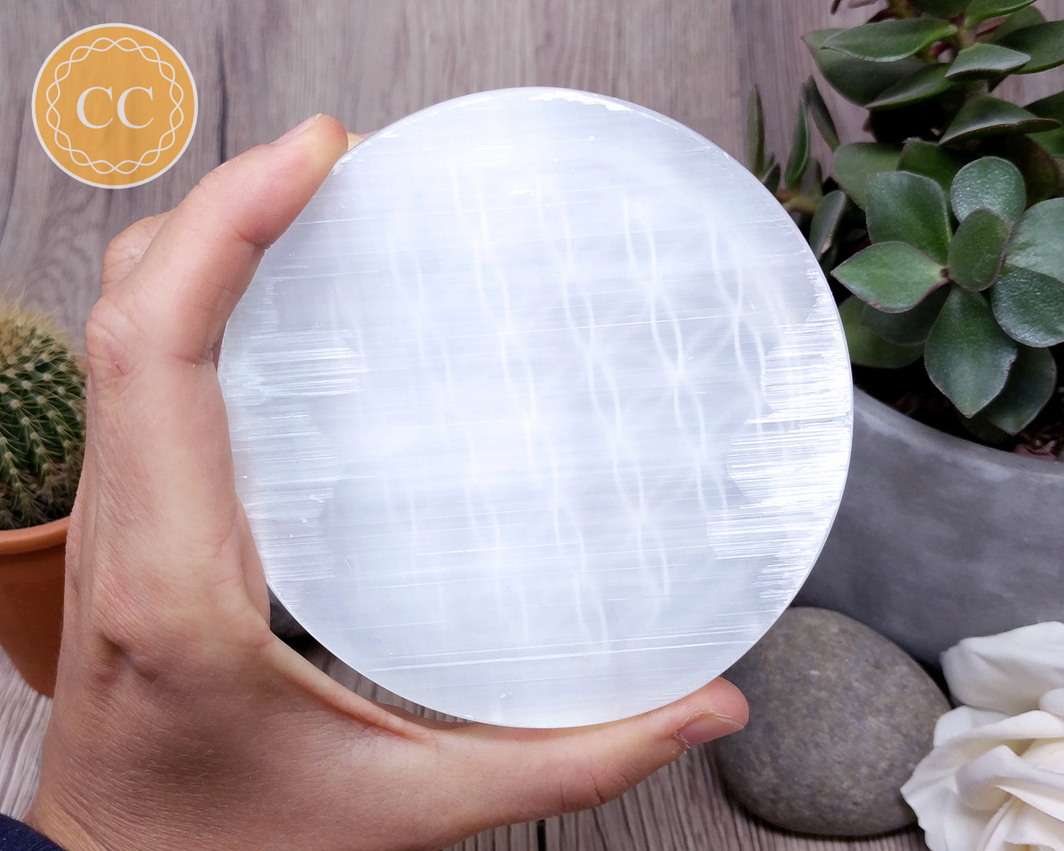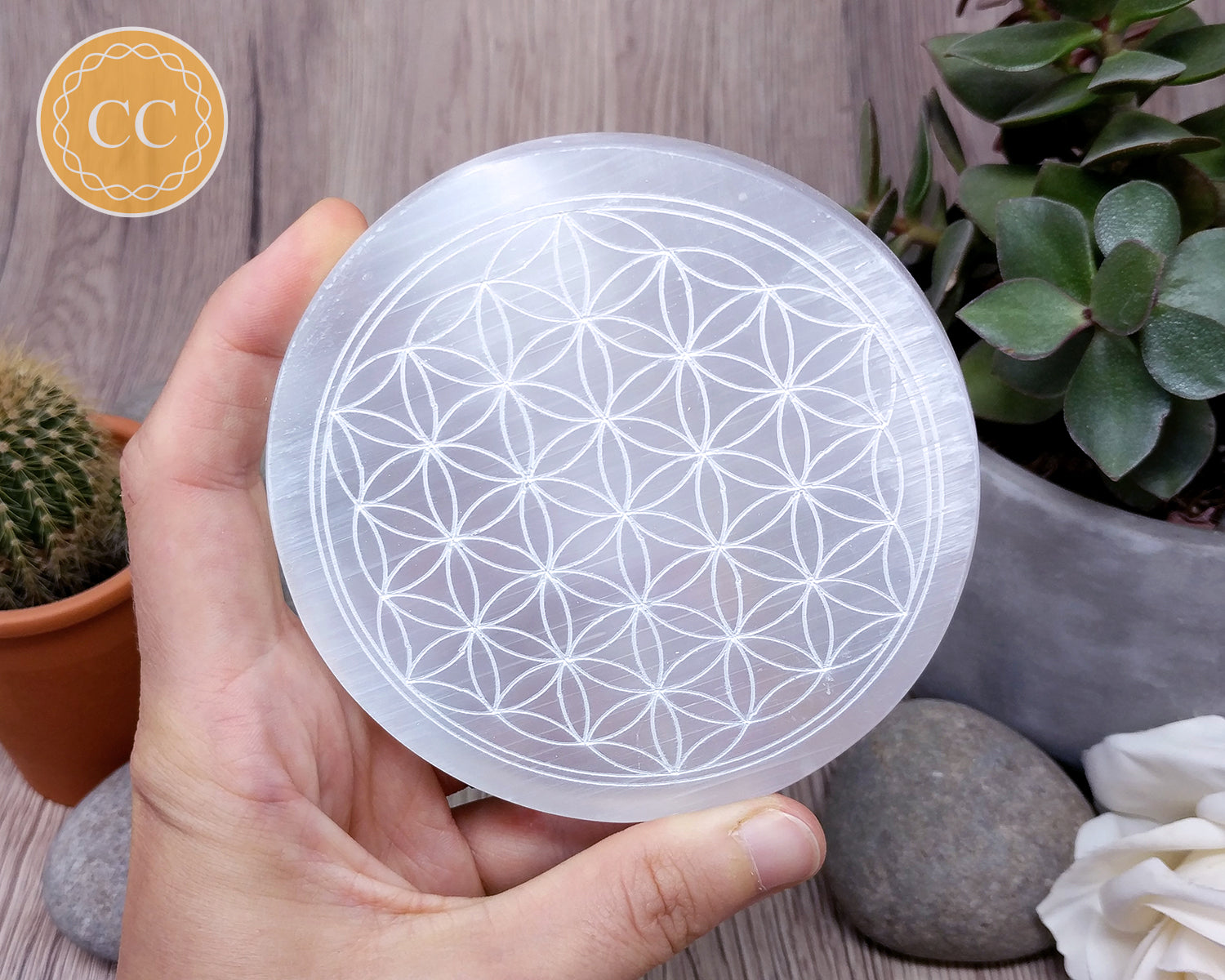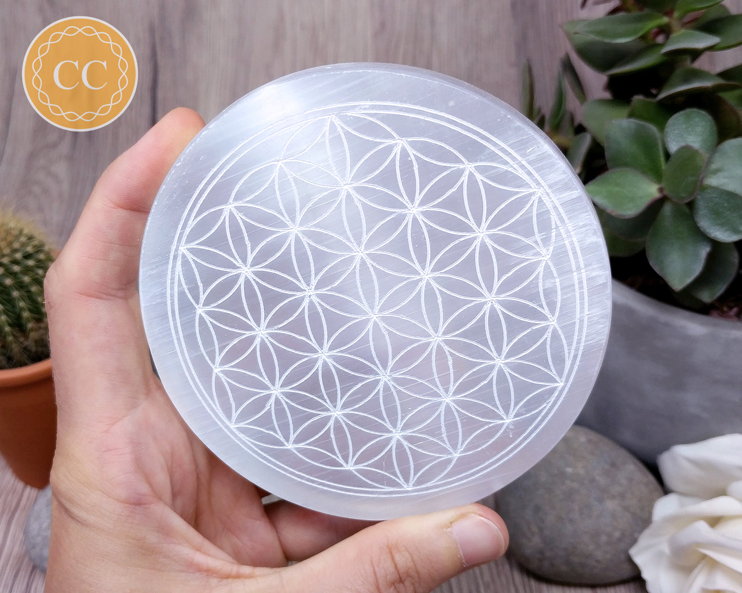 These engraved Satin Spar plates have the Flower of Life engraved onto it, they make perfect charging plates or crystal grid boards, and are each approx 100mm in diameter, and approx 12mm thick. You will receive one crystal, please note as Satin Spar can vary in appearance, some with clear patches of clear Selenite growth, each one will be unique.