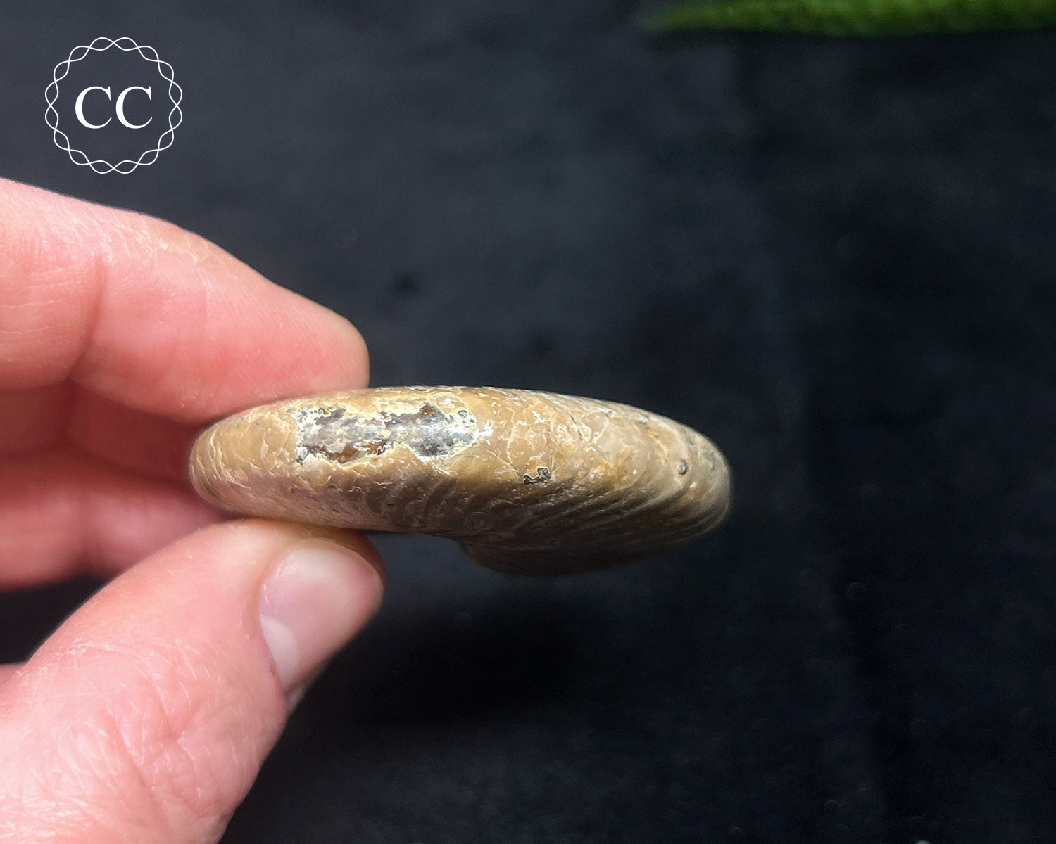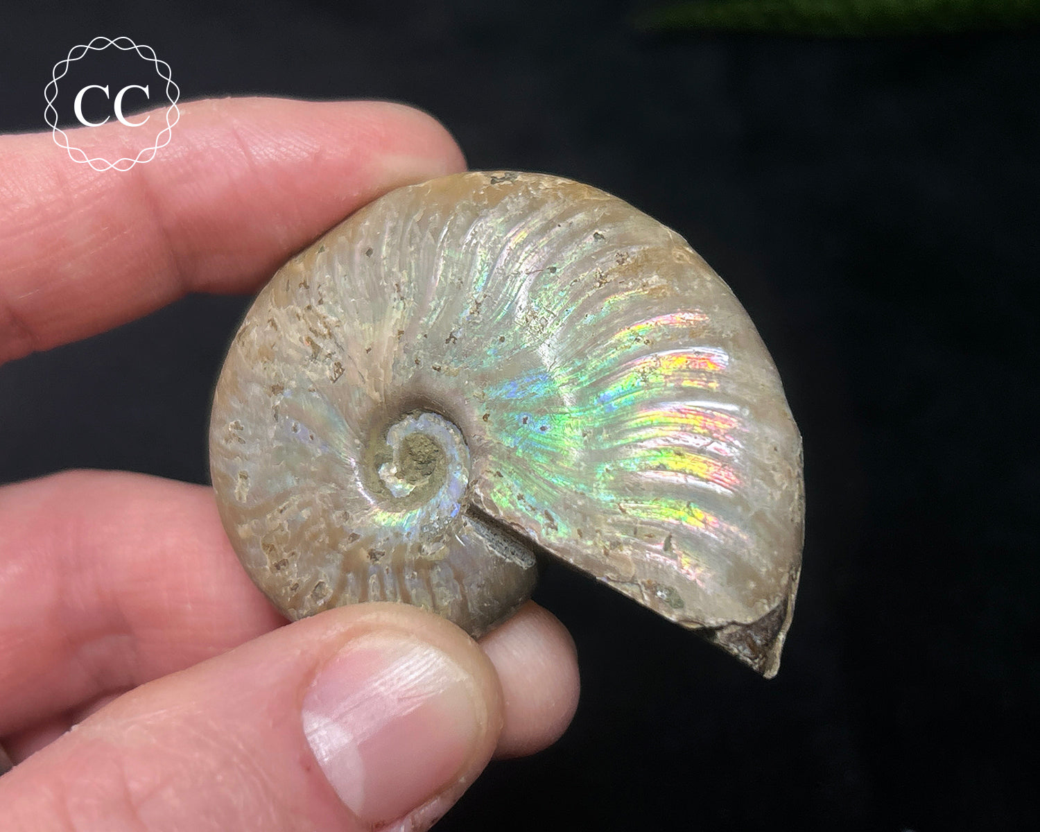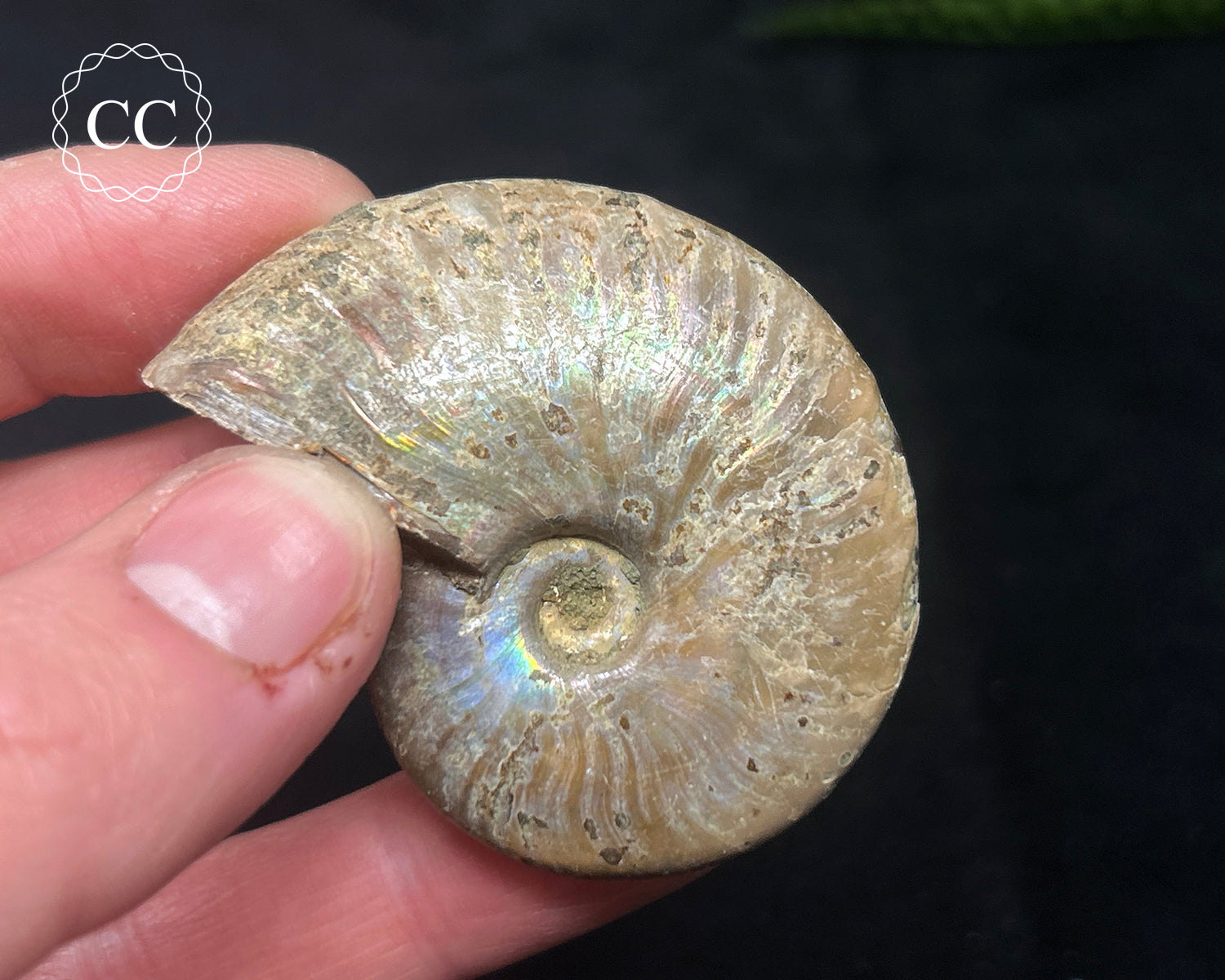 This Ammonite has been hand selected for its beautiful form, andᅠlovely rainbow iridescence to the outer shell. You will receive the exact item in the photos. Please note due to the lighting the colours do not show up so well on camera, they are much more rainbow in real life!