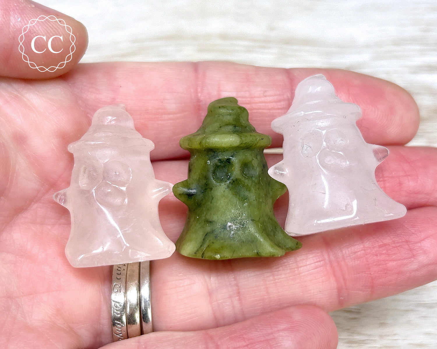 These adorable small ghost crystal carvings are perfect for Halloween! You will receive one small crystal ghost carving, the photos show an example of some of the ones we have available, each one measures between 29 to 32 mm tall.