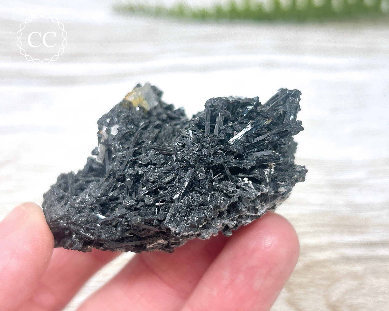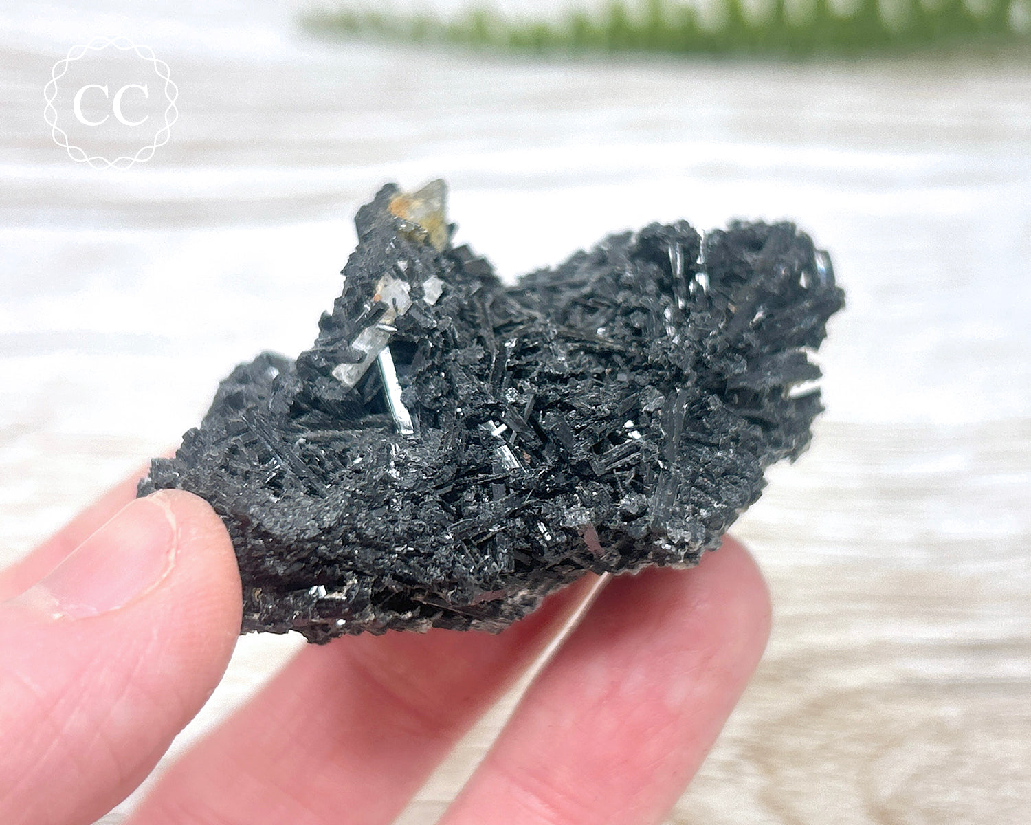 A beautiful cluster of elongated, thin Black Tourmaline crystals from Namibia, with a small Aquamarine crystal present. You will receive the exact Black Tourmaline crystal pictured.