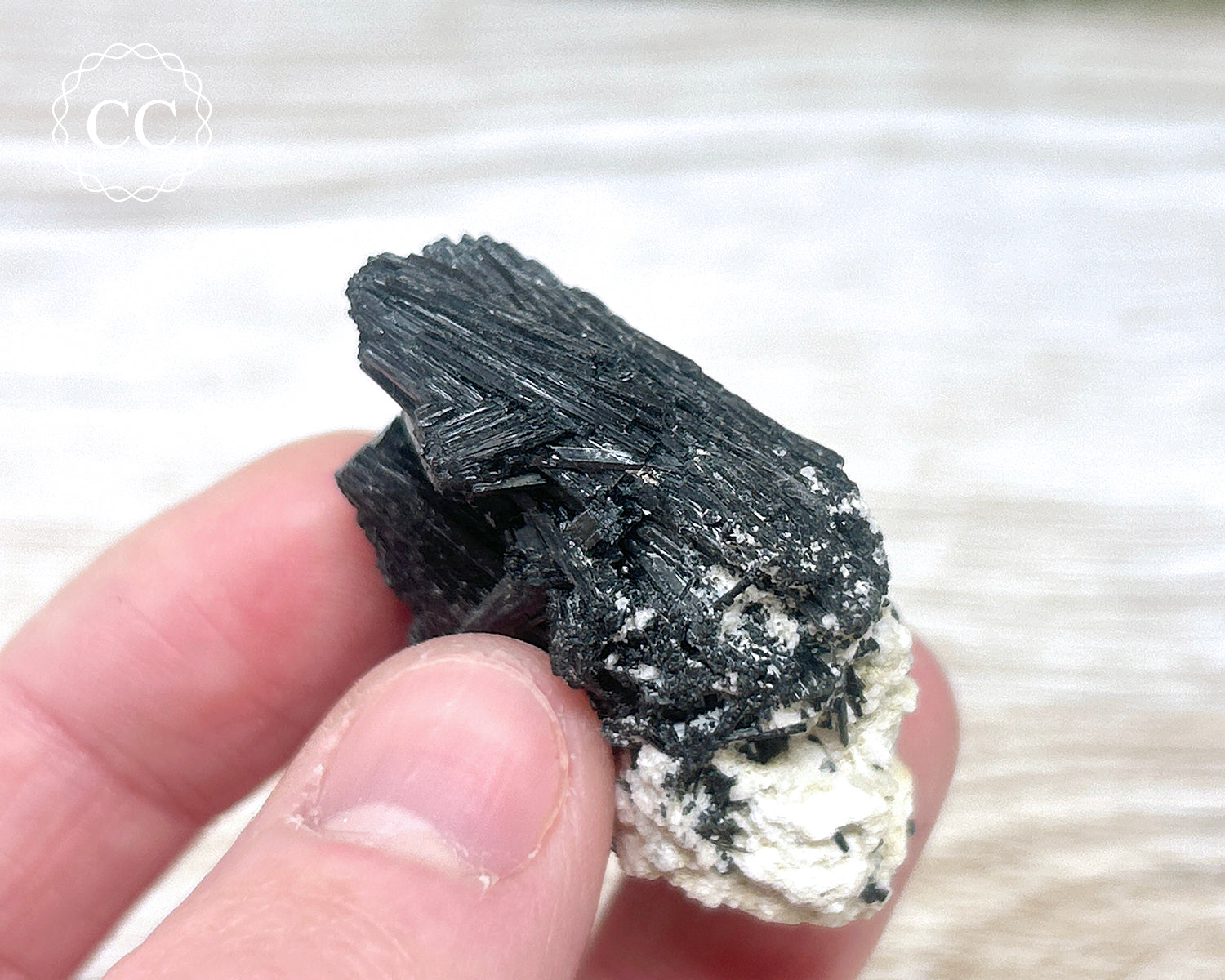 Black Tourmaline is a variety of Tourmaline known as Schorl, and commonly forms with other crystals including Mica, Quartz and Aquamarine.