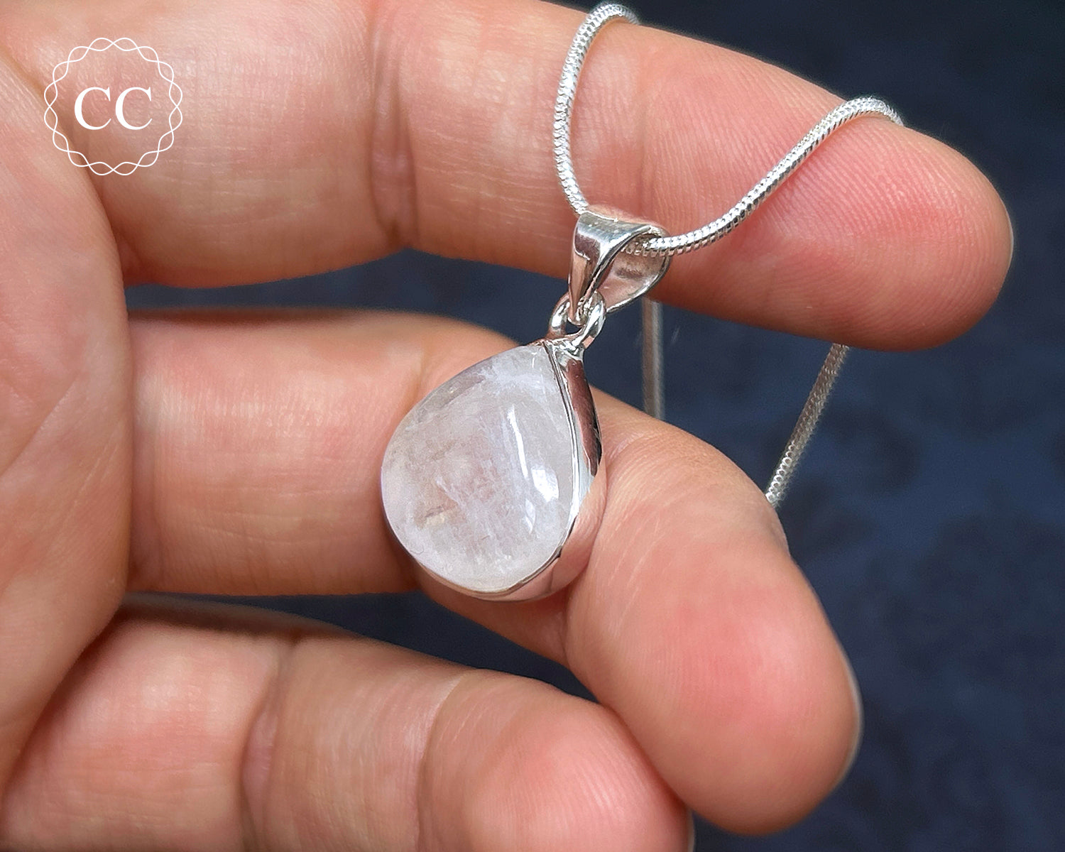 This beautiful A Grade Rainbow Moonstone Pendant is set in 925 Sterling Silver, with an 18 inch snake chain. You will receive the exact pendant shown in the photos, presented in a gift box. Dimensions are the size of the pendant, and do not include the bail.