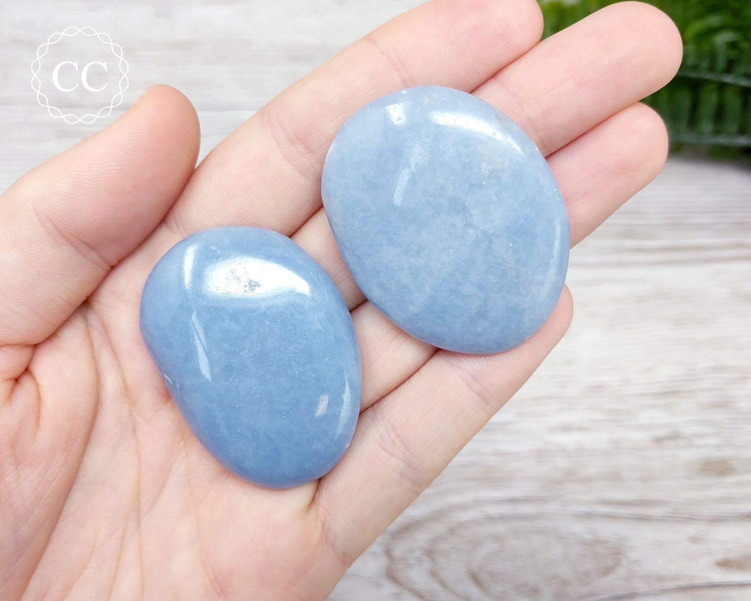 Lovely soft pastel blue Angelite palm stones from Peru, in a flatter style so are easy to carry around. You will receive one Angelite palm stone, an example of the ones you may receive is shown in the photos. Each one is between 40 - 50mm across.