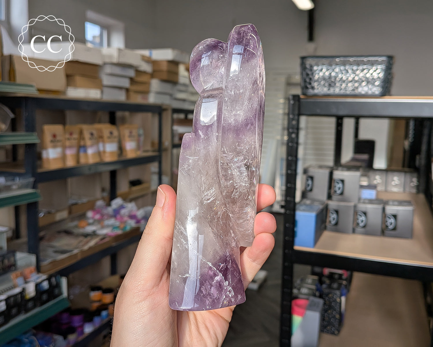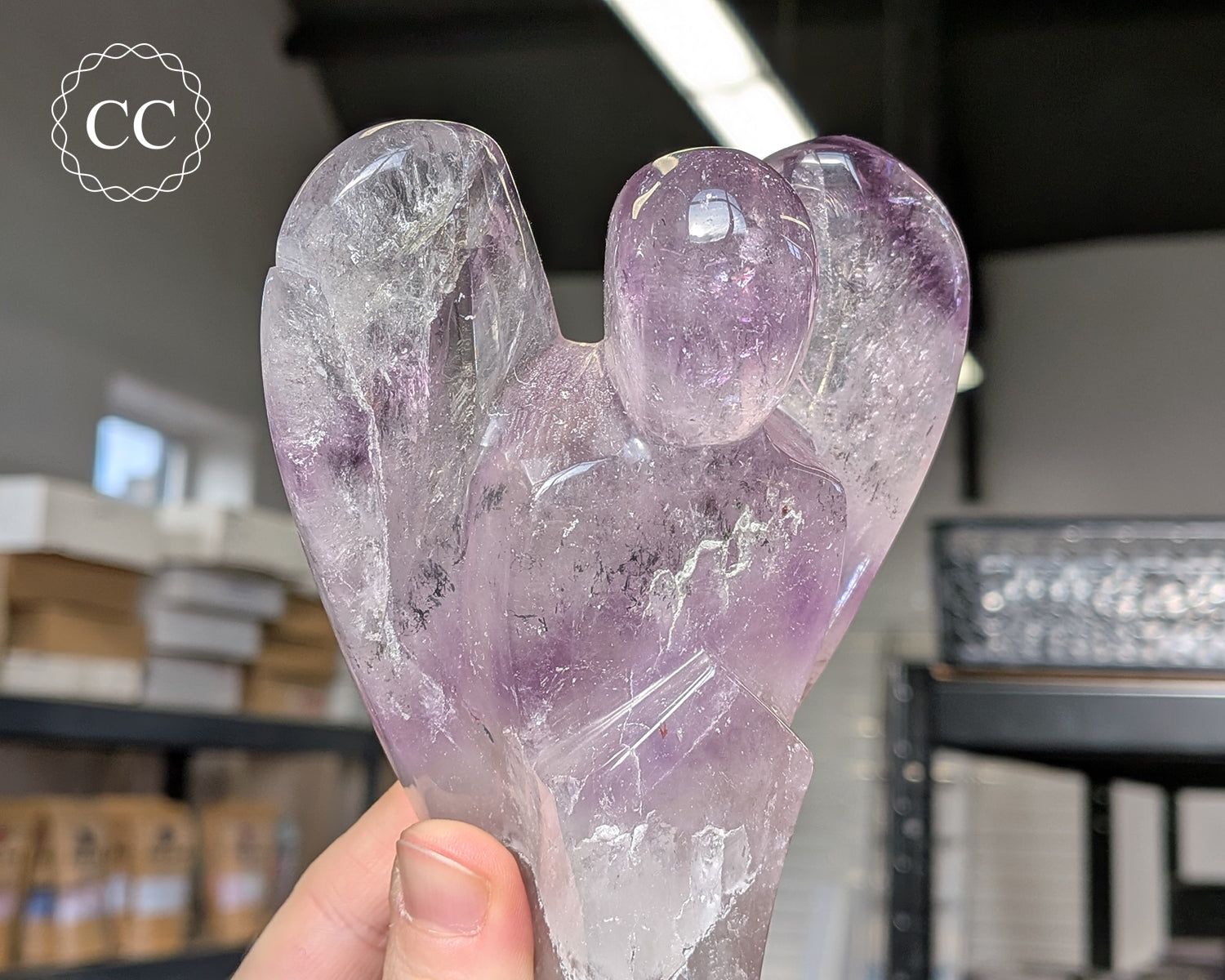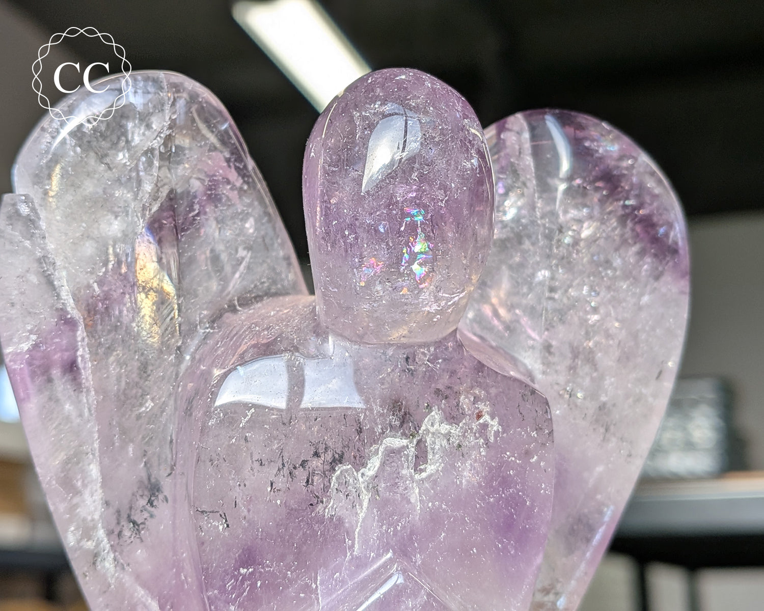This beautiful Amethyst Angel has been hand carved by a family we import from in Brazil, please note there is a natural fracture on the left wing as you look as it, please see photos for details. You will receive the exact Amethyst crystal shown in the photos.
