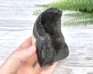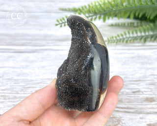 Unusual Septarian cut base freeform with druzy black crystals from Madagascar. You will receive the exact Septarian crystal pictured.