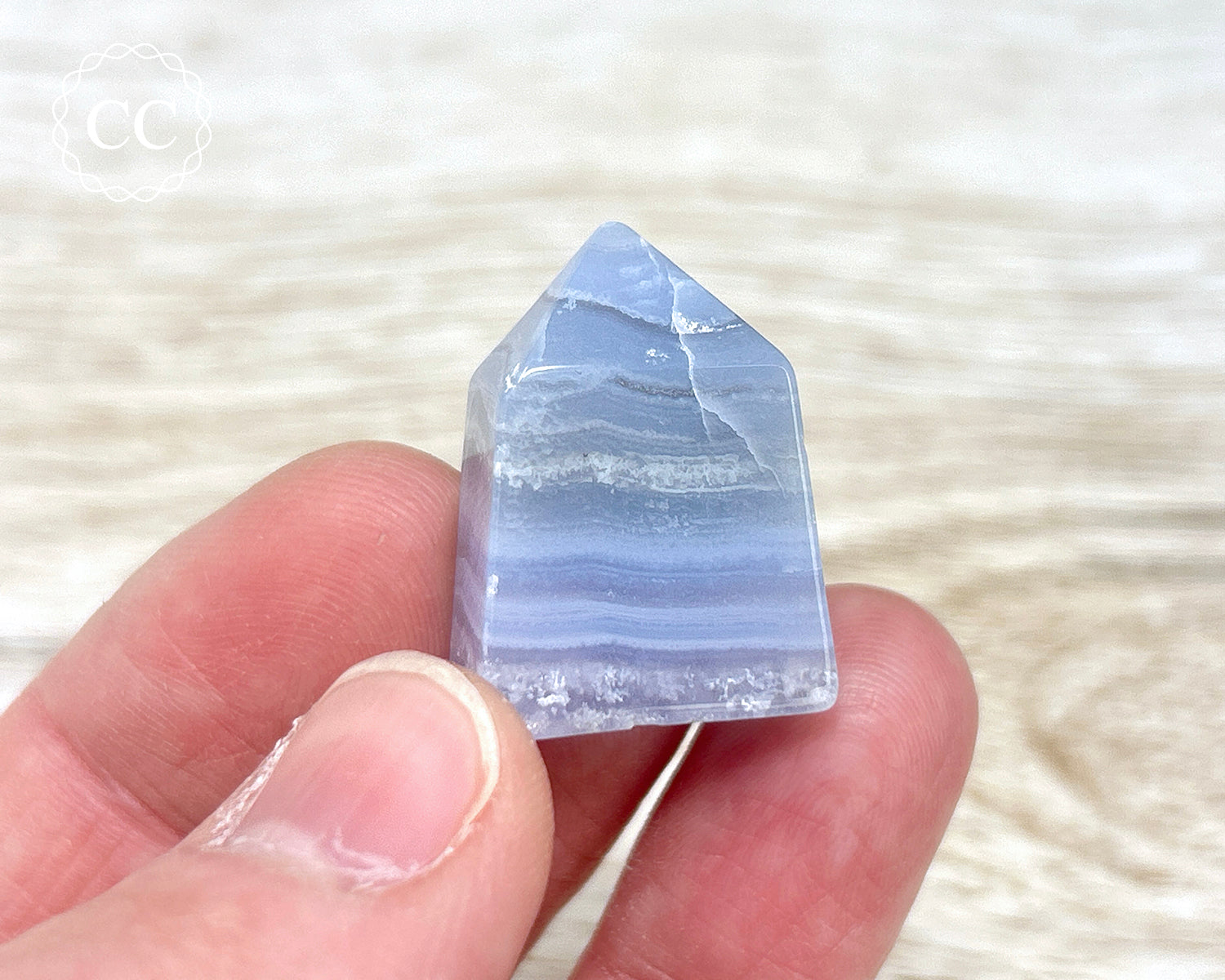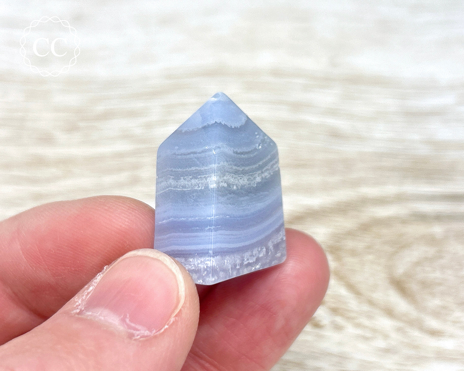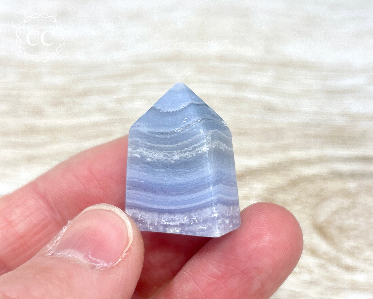 This beautiful Blue Lace Agate Tower is from Namibia, the original Blue Lace mine with well defined banding, rather than the newer find from Malawi. You will receive the exact crystal pictured.