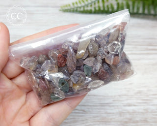 Lovely small Rutilated Quartz crystal chips. Perfect for crystal grids, candles and many other craft applications. You will receive one bag as shown in the photos, the chips shown in the hand are to show the colour, they do not represent 50g. Please note there may be a few other small crystal chips of different types in the bag due to the sorting process.