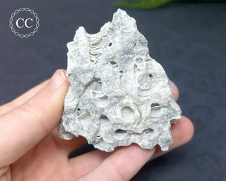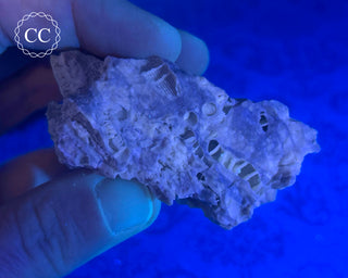This incredible specimen is fossil Coral from Clay Center, Ohio, with the empty coral tubes lined with tiny sparkling Calcite crystals that cause it to fluoresce yellow under longwave UV. You will receive the exact item pictured.