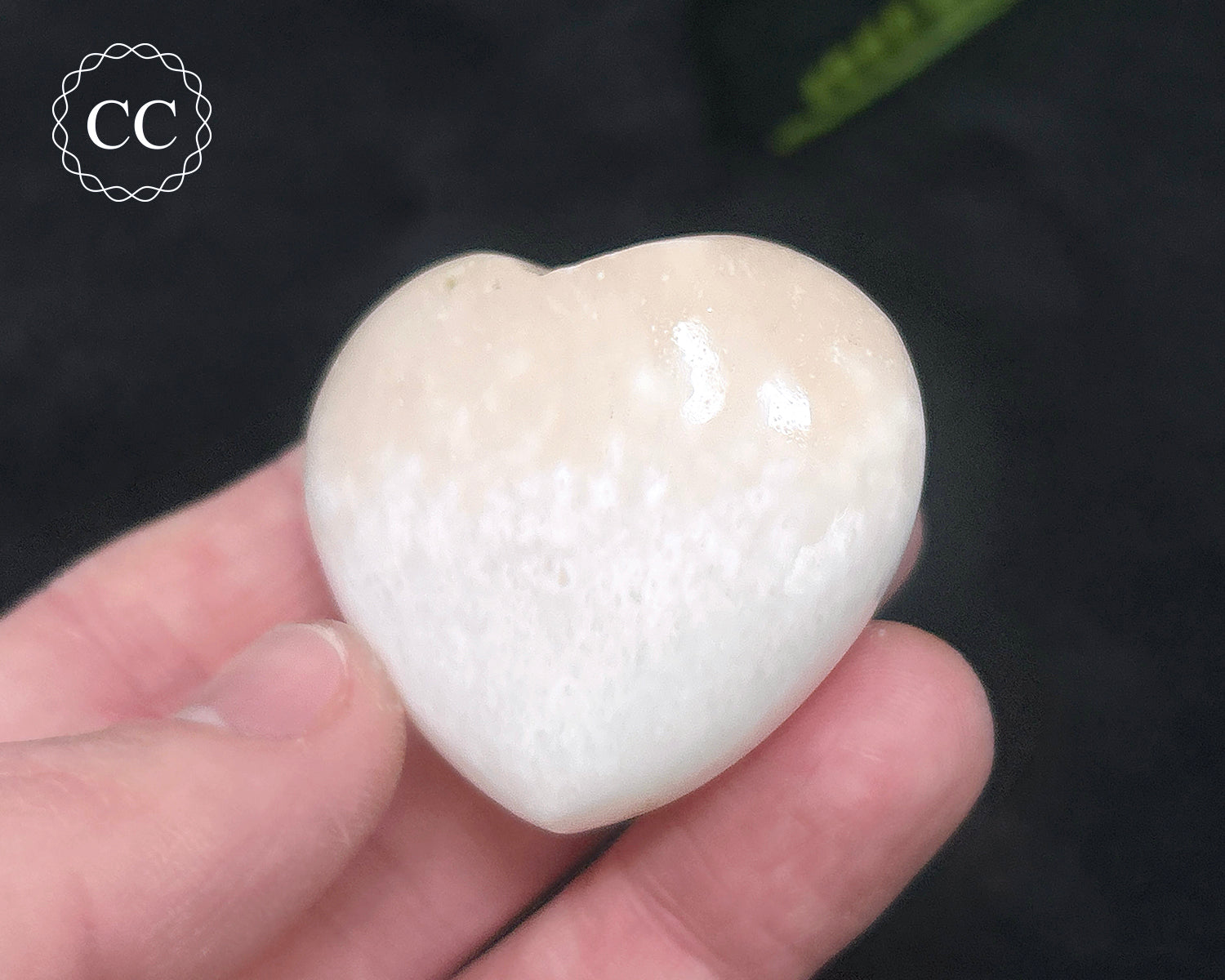 Lovely white and peach Scolecite heart from India, polished to show off the interesting crystal structure and lovely shimmer. You will receive the exact crystal shown in the photos.