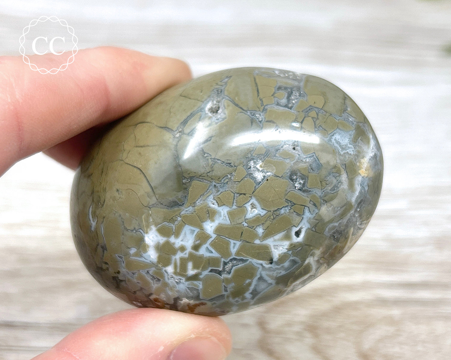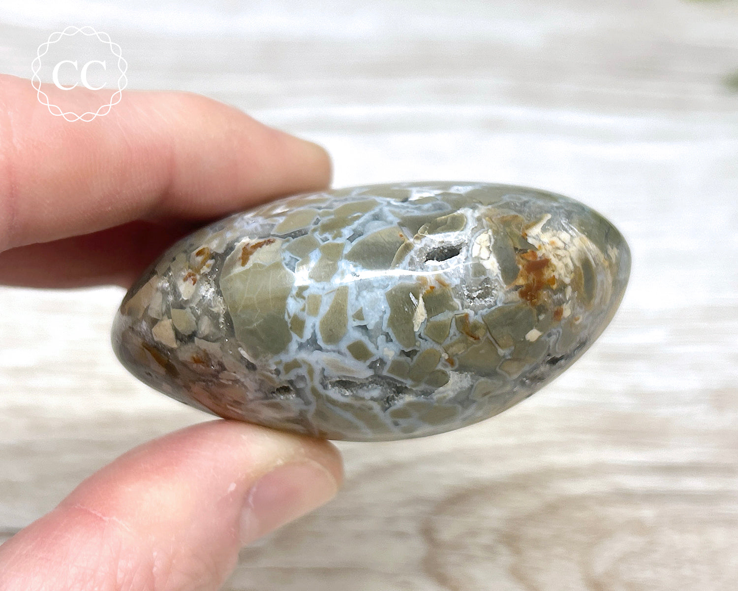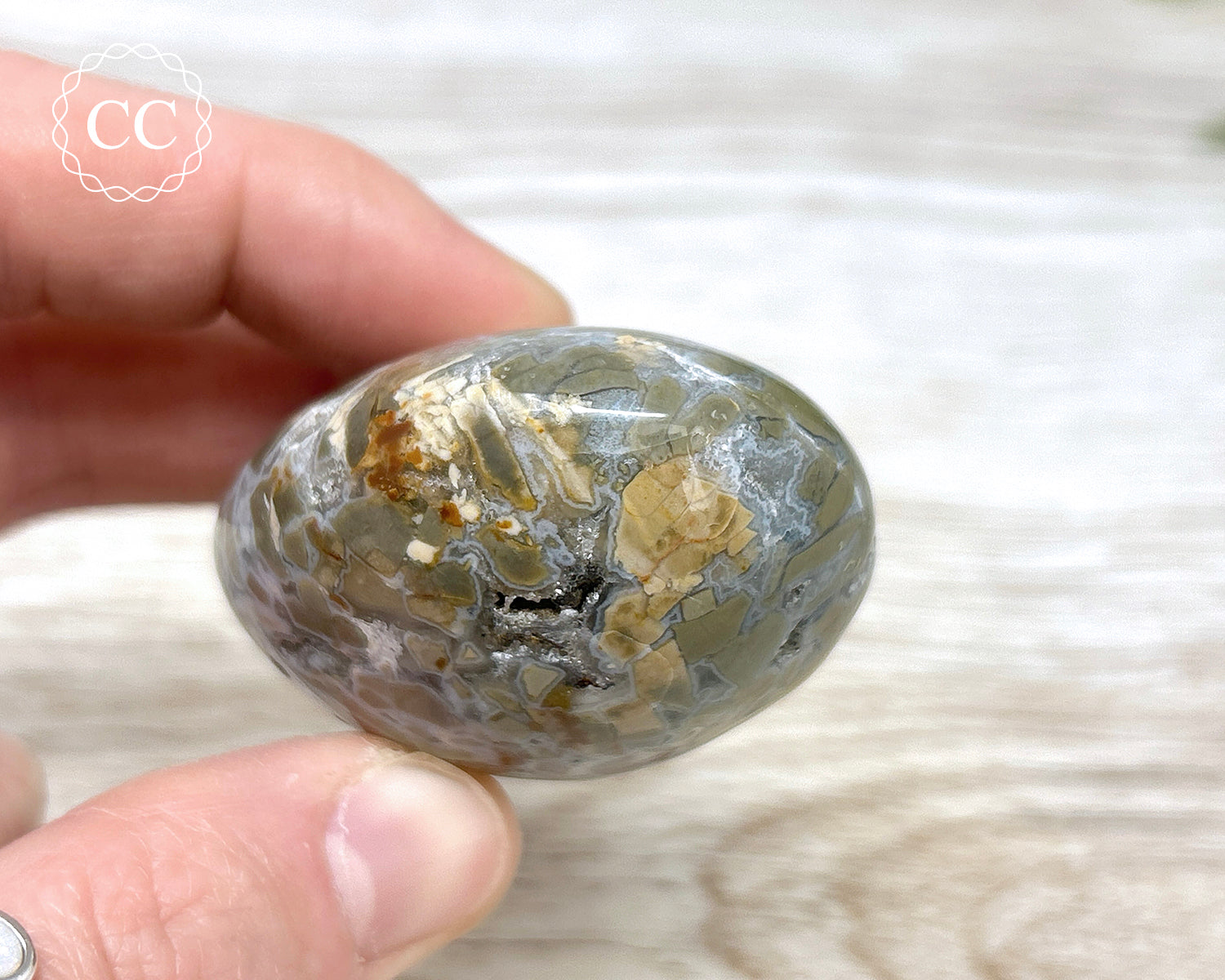 Lovely chunky Eggshell Jasper crystal palm stone from Madagascar with gorgeous patterns. Eggshell Jasper is a name for a type of Brecciated Jasper, named for it's light broken appearance, with some colourations called Ibis Jasper. You will receive the exact palmstone shown in the photos.