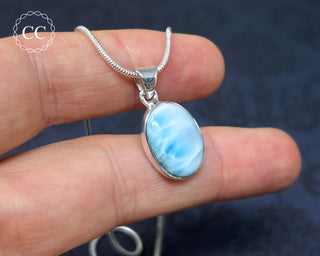Genuine hand selected Larimar pendant set in 925 Sterling Silver. Comes with an 18 inch snake chain and a CC gift box with a polishing cloth. Dimensions are the size of the pendant, and do not include the bail.