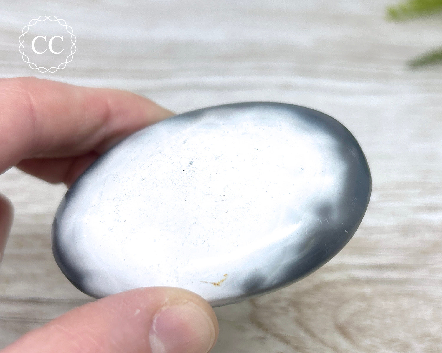 This chunky Orca Agate palmstone from Madagascar is a lovely size. You will receive the exact Orca Agate crystal pictured.