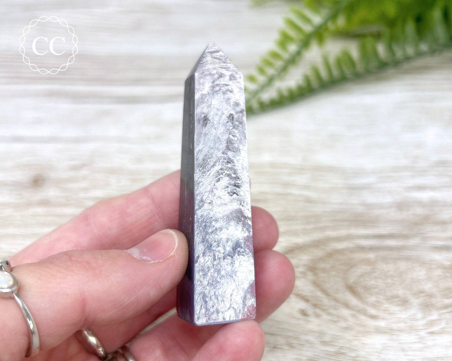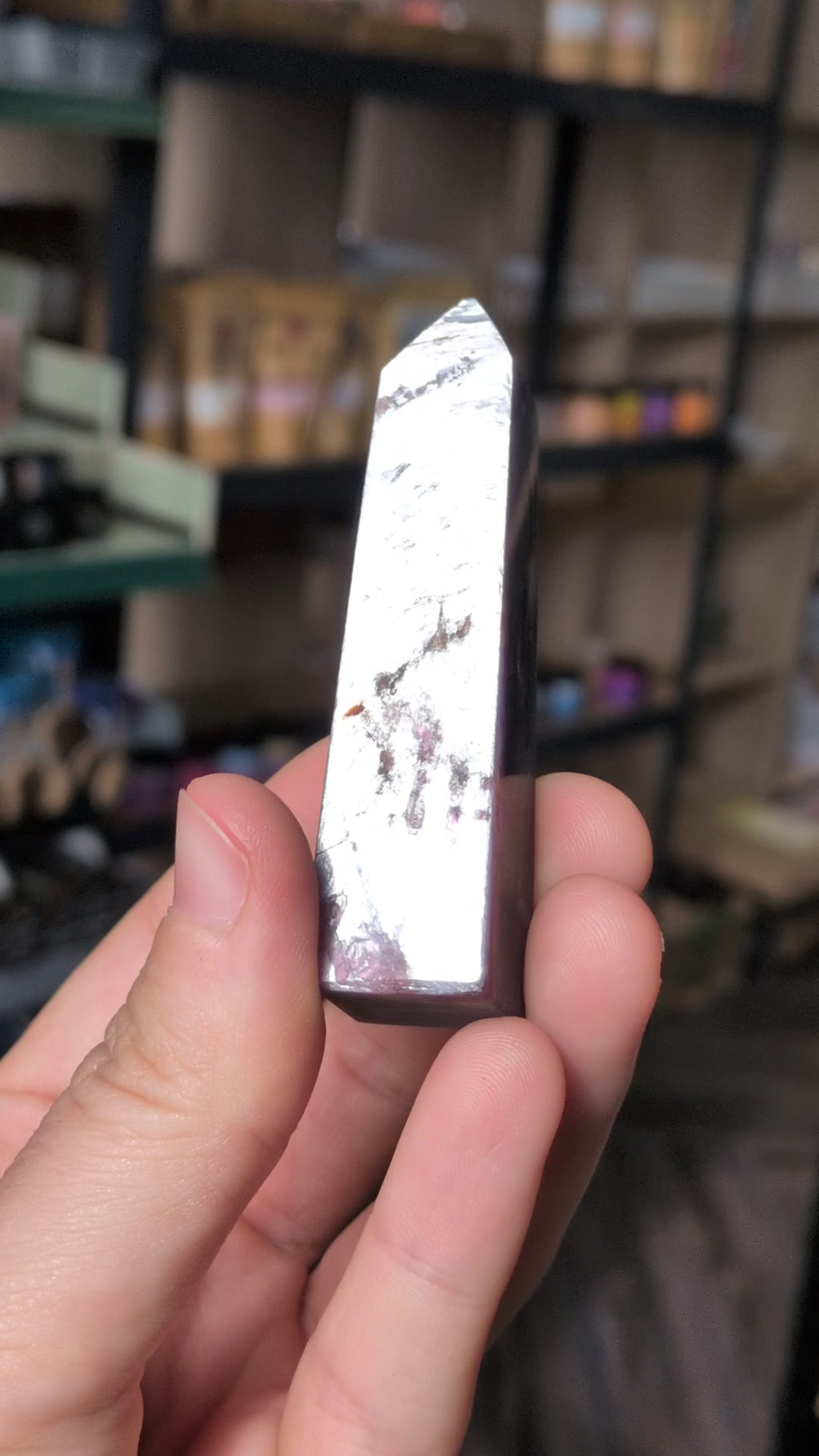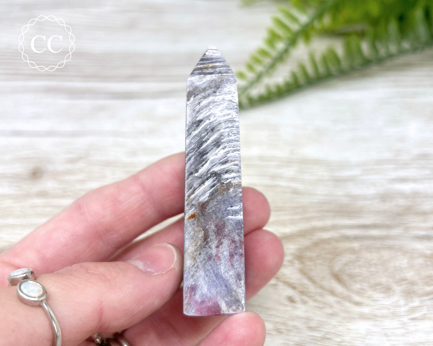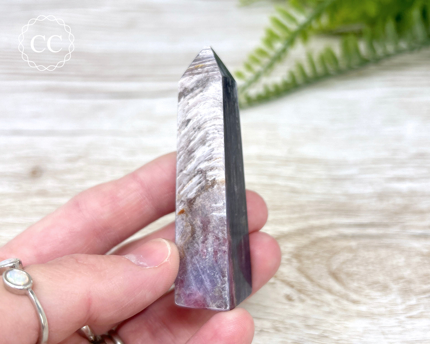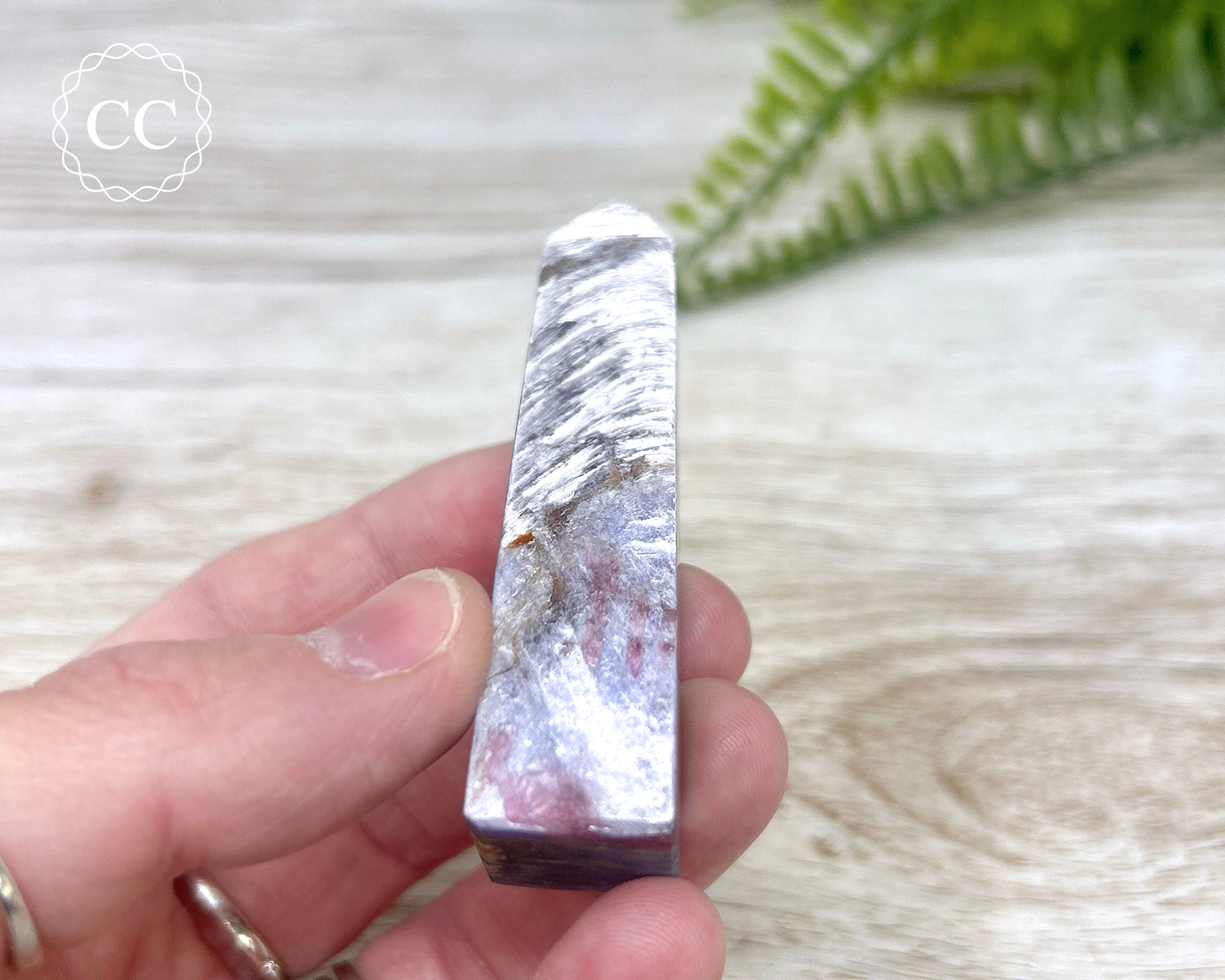 This stunning Gem Lepidolite and Pink Tourmaline tower is also known by the trade name Unicorn Stone. Unlike most Unicorn Stone, the Lepidolite that makes up the majority of this tower is classed as Gem Lepidolite, which means that the layers of the Lepidolite Mica are stacked together tightly, giving a very shiny reflection on two sides, and you can see the stacked very thin layers on the opposite two sides (if you backlight these sides then you will see a lovely soft purple glow). As with most Gem Lepidolite, these towers have been stabilised to minimise peeling of the layers, which is natural for mica sheets. You will receive the exact crystal in the photos.