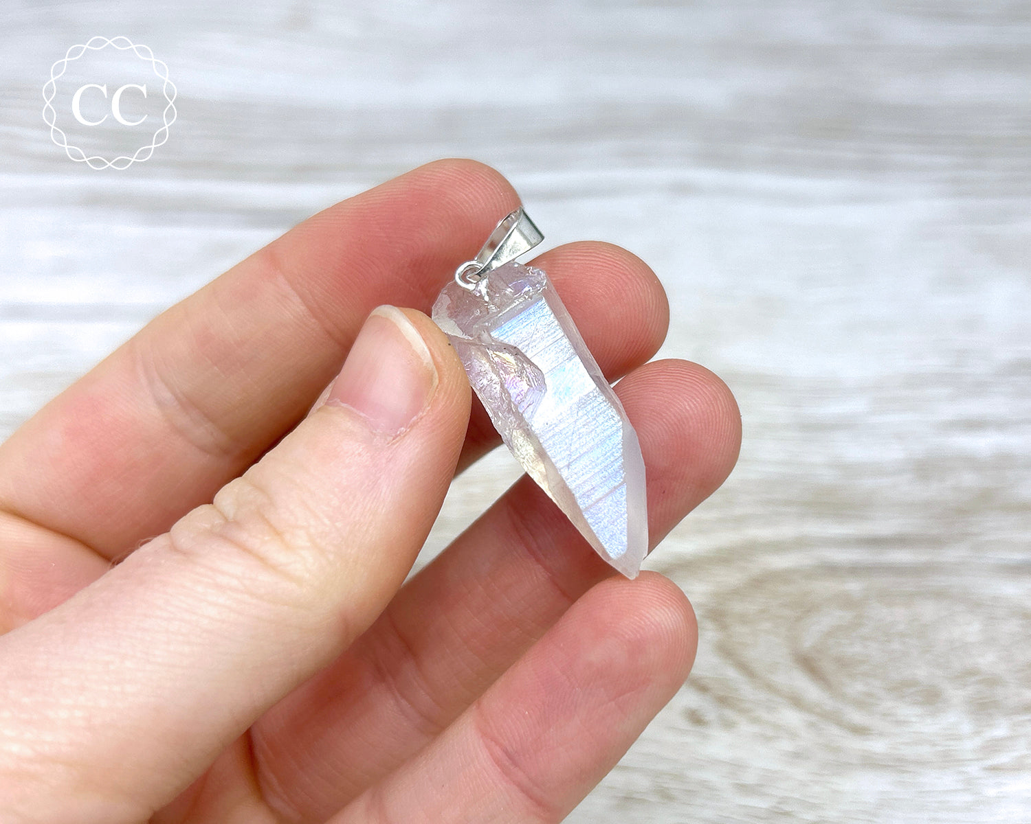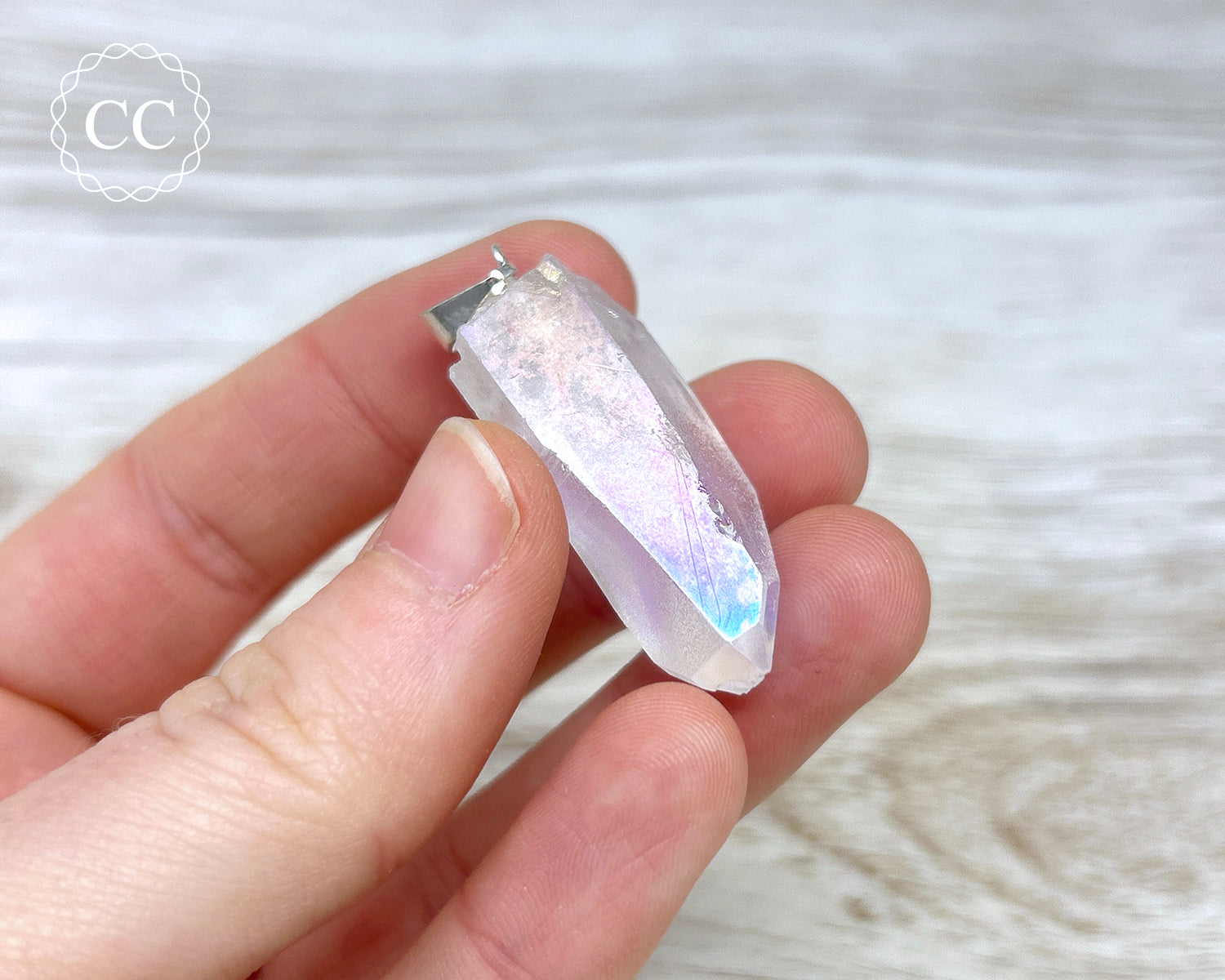 These Aura Quartz unpolished pendants come on a black cord. You will receive one necklace, each crystal (excluding bail) is between approx 22 - 40mm long, the photos show some of the ones we have available.
