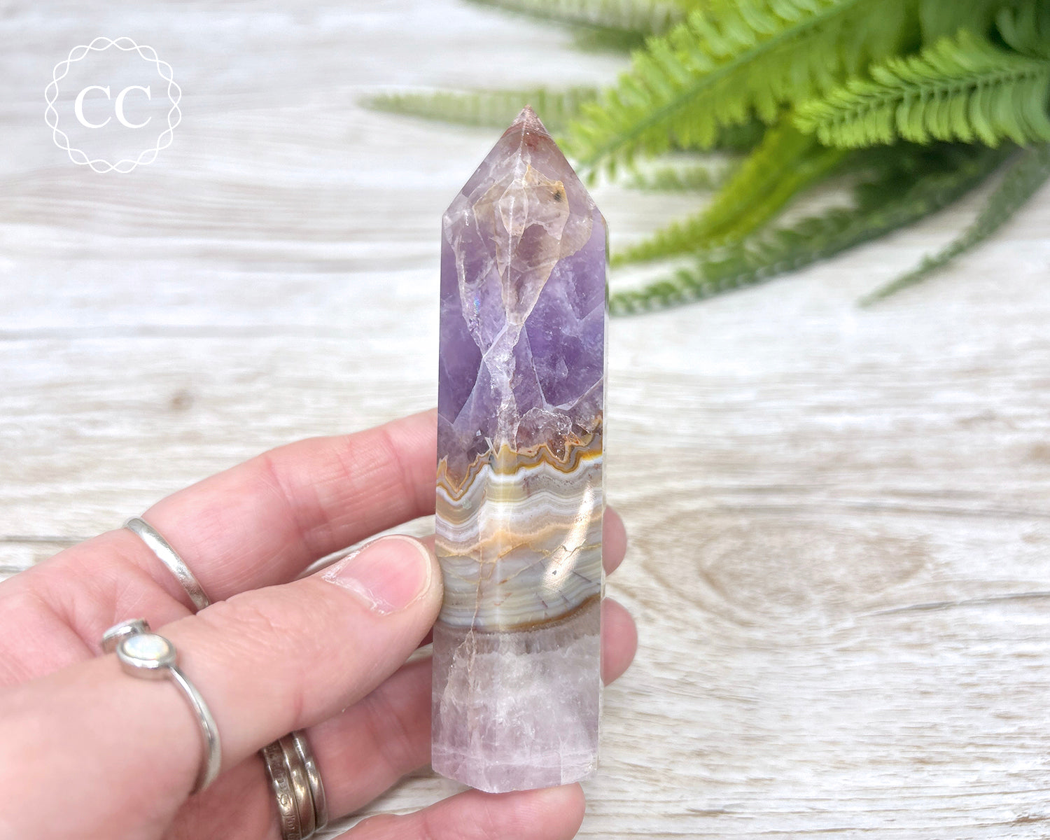 This new find from Mexico is a mixture of Amethyst with Lace Agate banding. You will receive the exact crystal in the pictures.