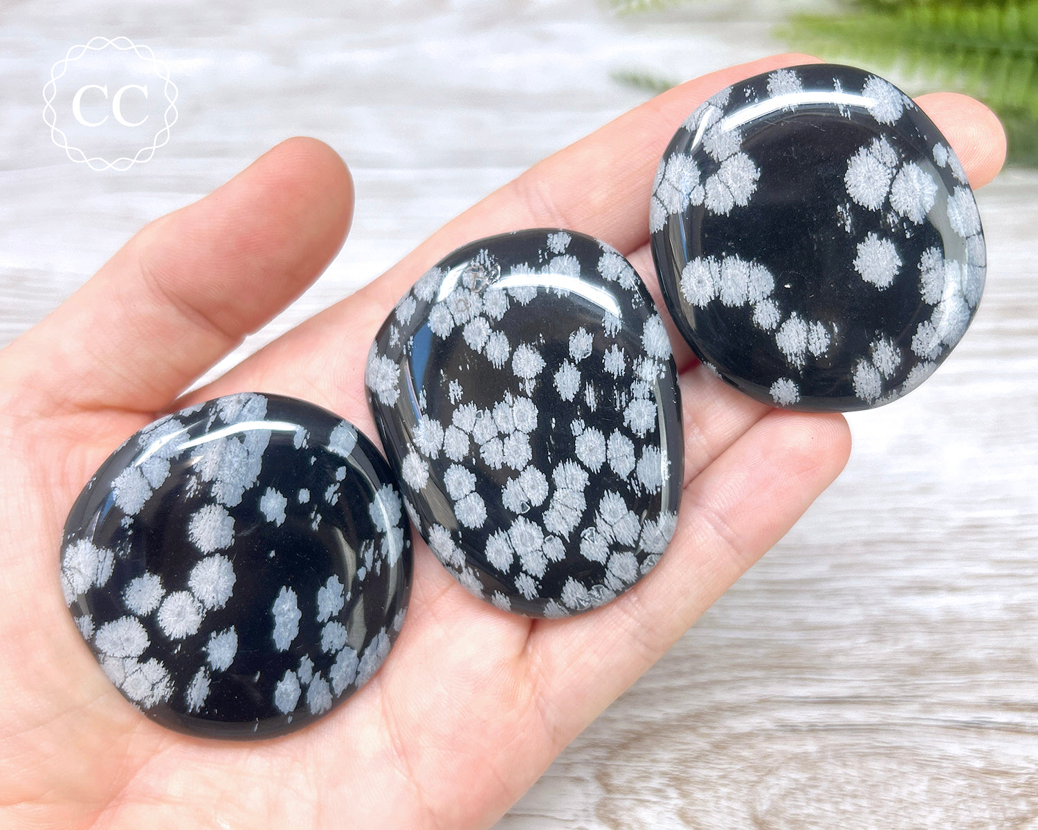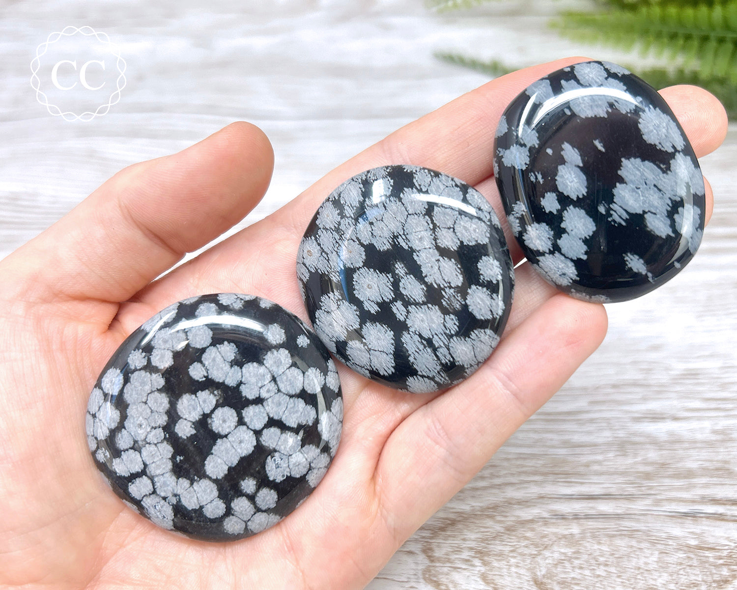 Snowflake Obsidian polished palm stones, you will receive one palmstone in the size of your choice. The photos show a selection of the ones we have available.