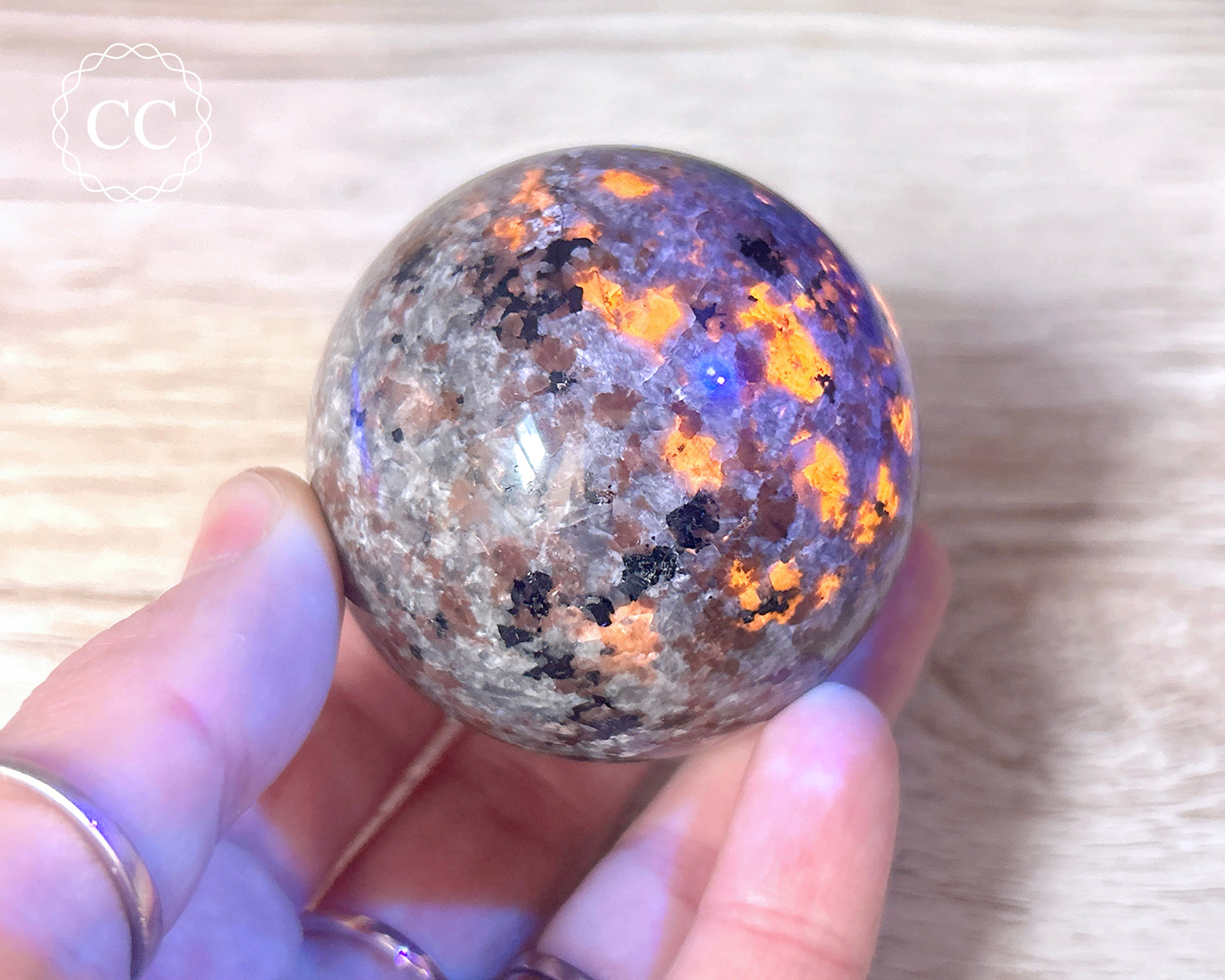 Lovely polished UV reactive Syenite fluorescent Sodalite sphere, also known as Firestone. This is often called Yooperlite, but it due to it being trademarked from a different location it cannot be known as this, although it is a very similar material. This is shown under both UV lighting (showing the orange fluorescence, and normal lighting). You will receive the exact crystal in the picture. Sphere stand not included, choice of sphere stands available - browse stands.